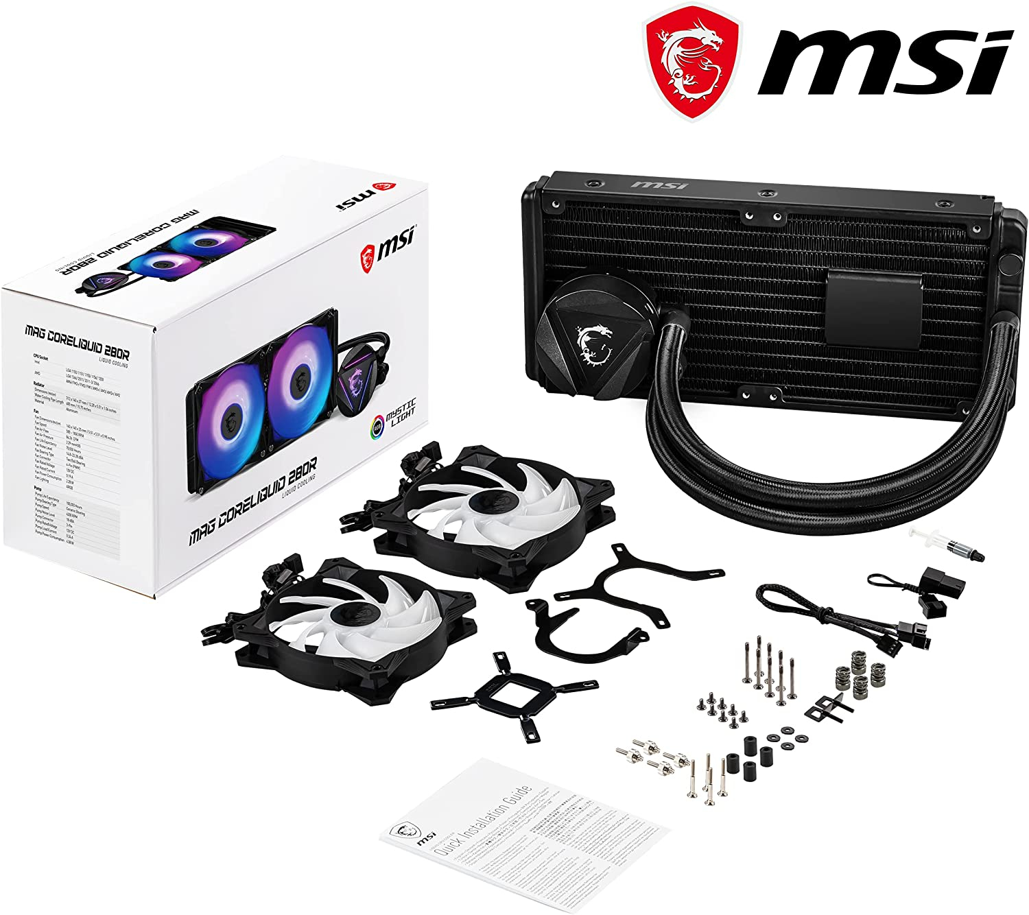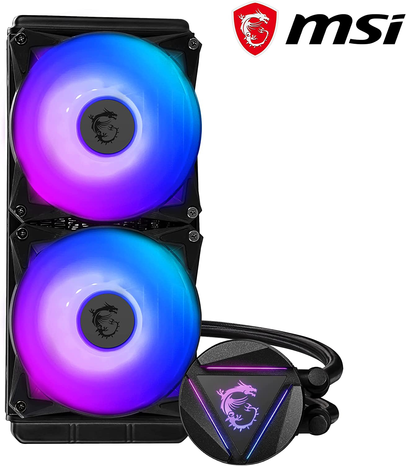 ÉTOUFFER TOUTE OPPOSITION Les refroidisseurs liquides AIO de CPU MSI MAG CORELIQUID de la Série R combinent des options de rétroéclairage ARGB polyvalentes avec un design aux caractéristiques innovantes. La caractéristique distinctive de la Série R est son couvercle de waterblock ARGB rotatif à 270 degrés avec le logo MSI (Mystic Light). Le radiateur en aluminium est conçu avec un design Split-Flow aux flux séparés pour une meilleure dissipation thermique, ainsi qu’une pompe triphasée intégrée, qui aide à atténuer le bruit et améliore la durée de vie de la pompe (100 000 heures). Les ventilateurs ARGB offrent à la fois des performances et une esthétique stylées, tandis que les tuyaux anti-évaporation garantissent que l’eau reste en boucle fermée à l’intérieur du système. Totalement compatible avec les sockets CPU AMD* (AM4, FM2+, FM2, FM1, AM3+, AM3, AM2+, AM2) et Intel (LGA 1150, 1151, 1155, 1156, 1200, 1366, 2011, 2011-3, 2066), les kits MAG CORELIQUID R-Series sont dotés de pâte thermique et d’accessoires de câble. * Prise en charge des sockets AMD TR4, sTRX4, SP3 et câble de ventilateur réducteur de bruit disponibles avec le MAG CORELIQUID 360R.