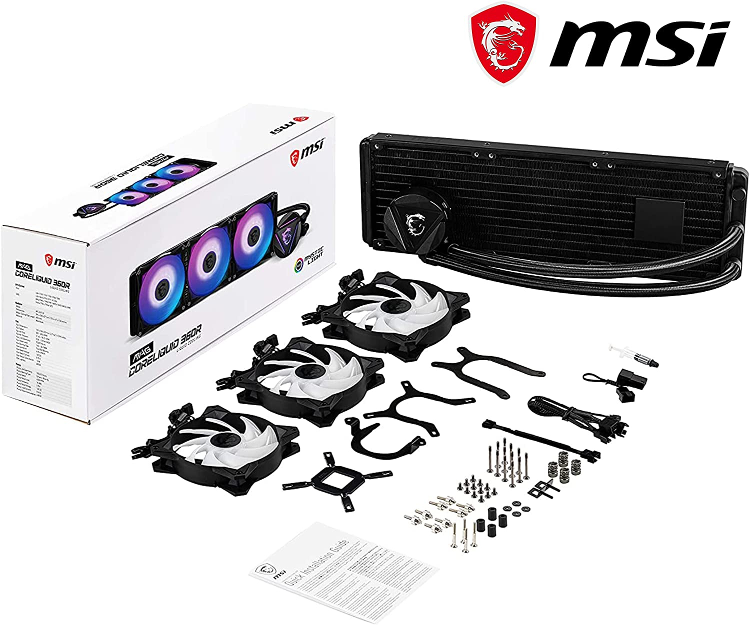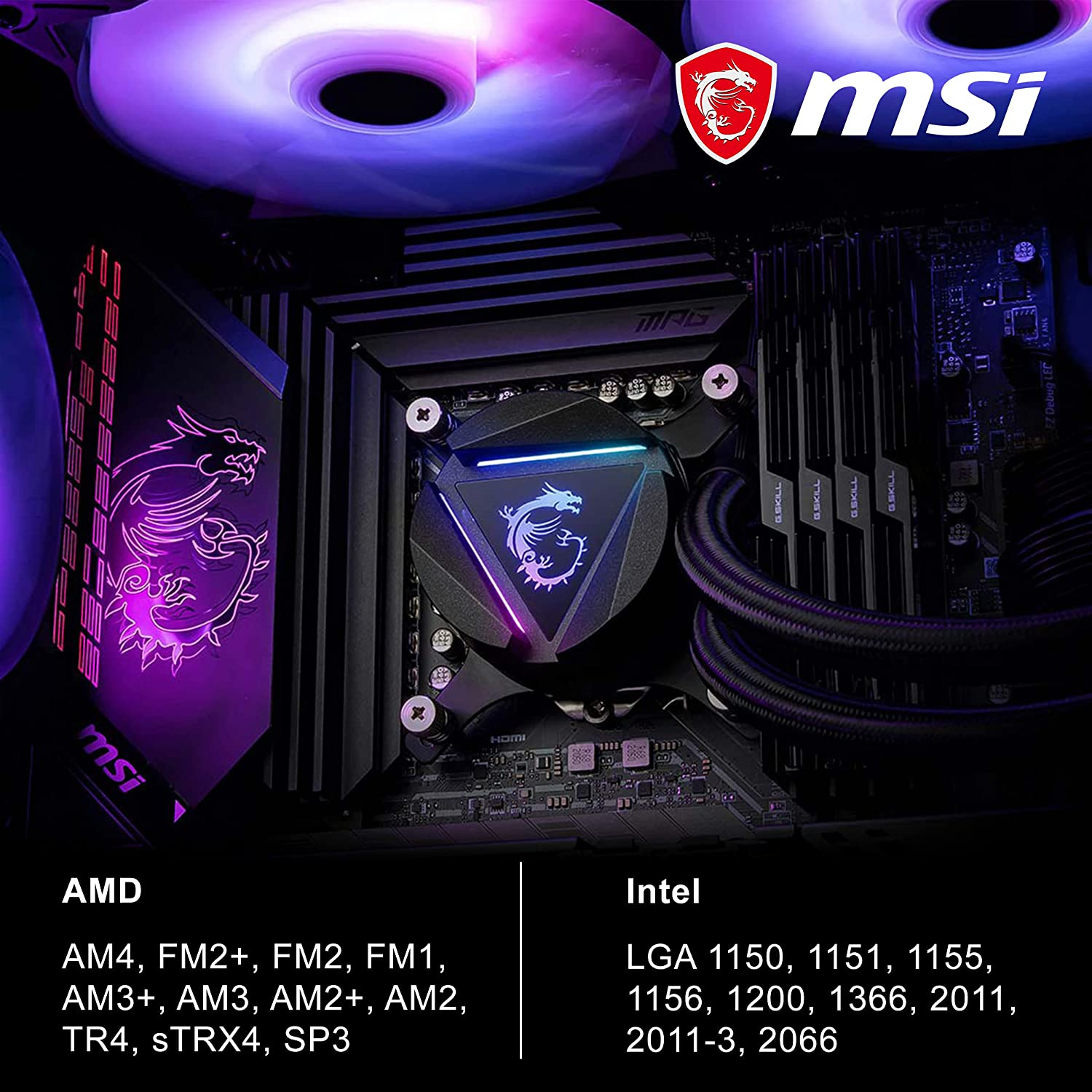 ÉTOUFFER TOUTE OPPOSITION Les refroidisseurs liquides AIO de CPU MSI MAG CORELIQUID de la Série R combinent des options de rétroéclairage ARGB polyvalentes avec un design aux caractéristiques innovantes. La caractéristique distinctive de la Série R est son couvercle de waterblock ARGB rotatif à 270 degrés avec le logo MSI (Mystic Light). Le radiateur en aluminium est conçu avec un design Split-Flow aux flux séparés pour une meilleure dissipation thermique, ainsi qu’une pompe triphasée intégrée, qui aide à atténuer le bruit et améliore la durée de vie de la pompe (100 000 heures). Les ventilateurs ARGB offrent à la fois des performances et une esthétique stylées, tandis que les tuyaux anti-évaporation garantissent que l’eau reste en boucle fermée à l’intérieur du système. Totalement compatible avec les sockets CPU AMD* (AM4, FM2+, FM2, FM1, AM3+, AM3, AM2+, AM2) et Intel (LGA 1150, 1151, 1155, 1156, 1200, 1366, 2011, 2011-3, 2066), les kits MAG CORELIQUID R-Series sont dotés de pâte thermique et d’accessoires de câble. * Prise en charge des sockets AMD TR4, sTRX4, SP3 et câble de ventilateur réducteur de bruit disponibles avec le MAG CORELIQUID 360R. Marque: la notion de bruit est purement suggestive et dépend du type d’utilisation intensif ou pas pour refroidir le PC