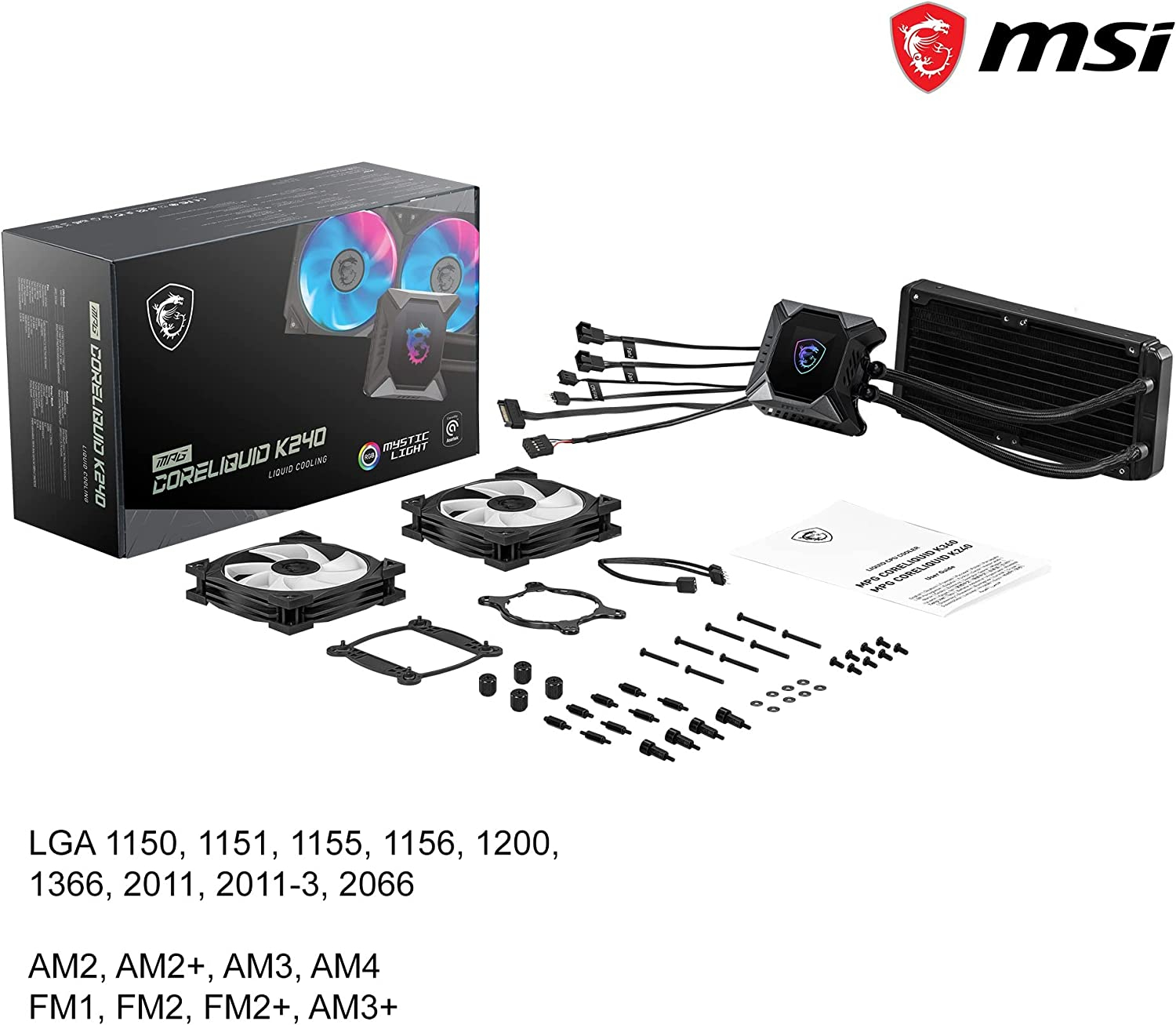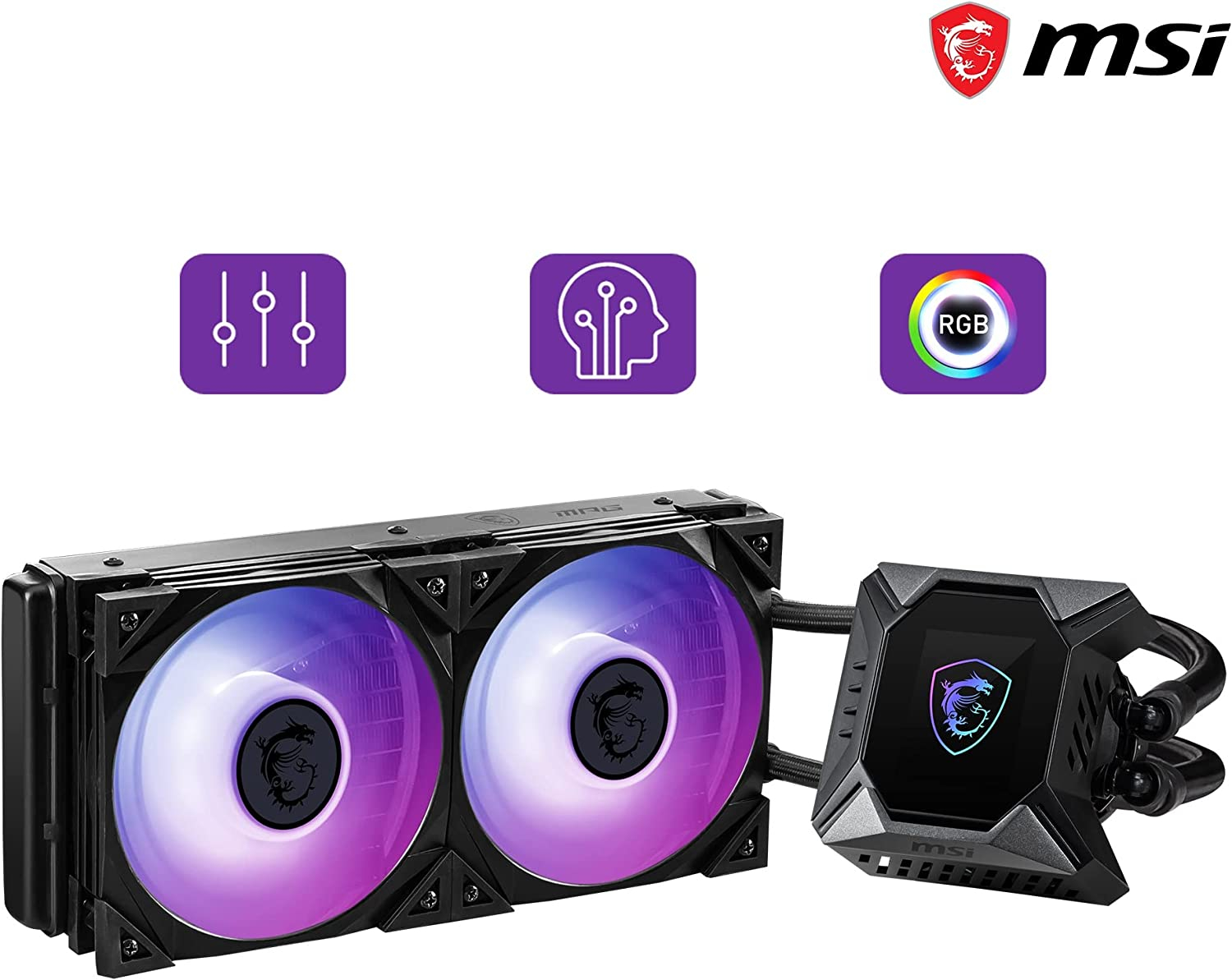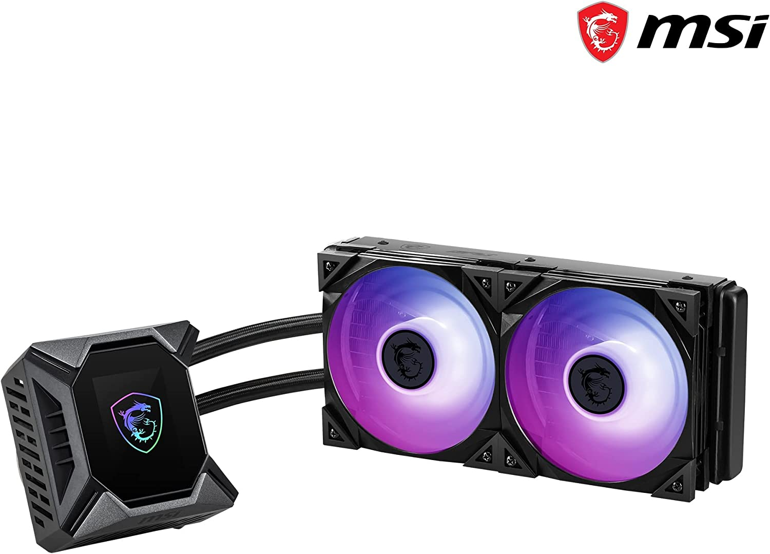 Le MPG CORELIQUID K240 MSI est un refroidisseur AIO liquide haut de gamme pour les CPUs AMD et Intel avec un bloc radiateur en aluminium de 272.5x120mm pour un refroidissement silencieux et très efficace. Avec son spectaculaire écran LCD 2.4″ entièrement personnalisable, qui permet de surveiller les performances en temps réel; Deux ventilateurs TORX FAN 4.0 x120mm avec une haute pression et un logiciel de refroidissement avancé Gaming Intelligent (GI) et rétroéclairés Mystic Light, le MPG CORELIQUID K240 redéfinit la conception de refroidissement liquide pour CPU, à la fois en termes de performances et d’esthétique.