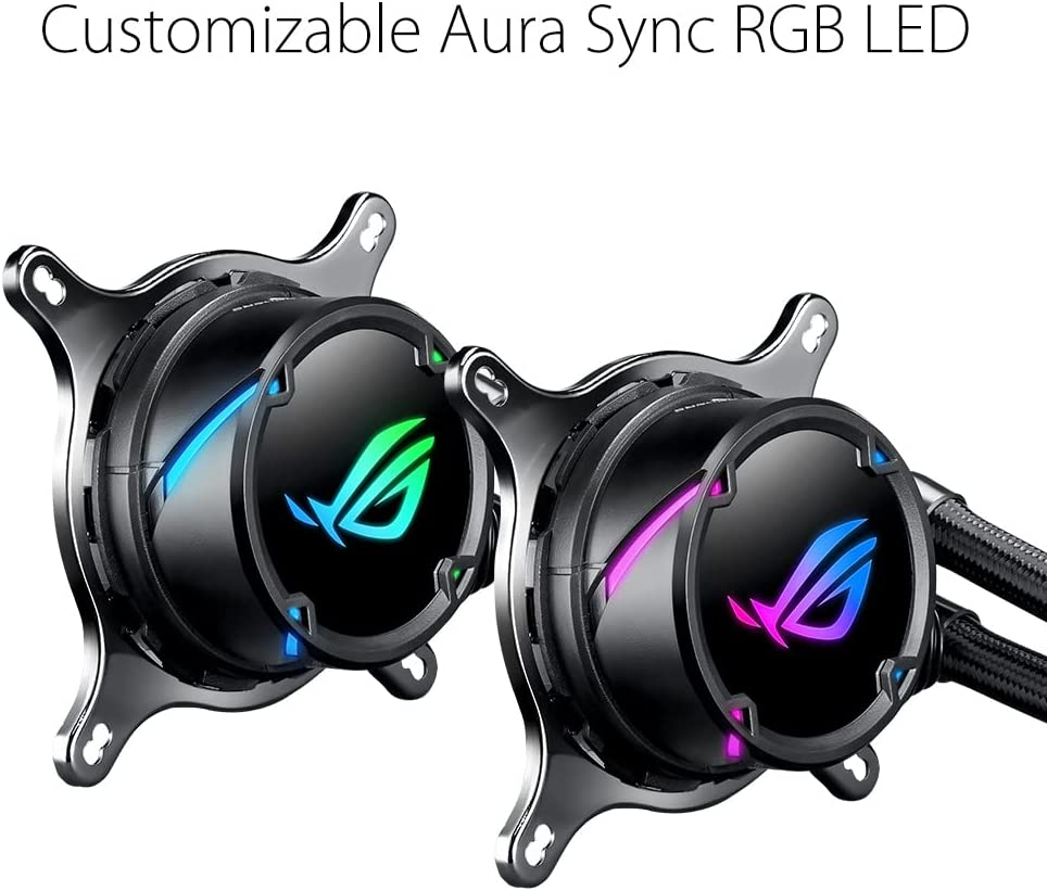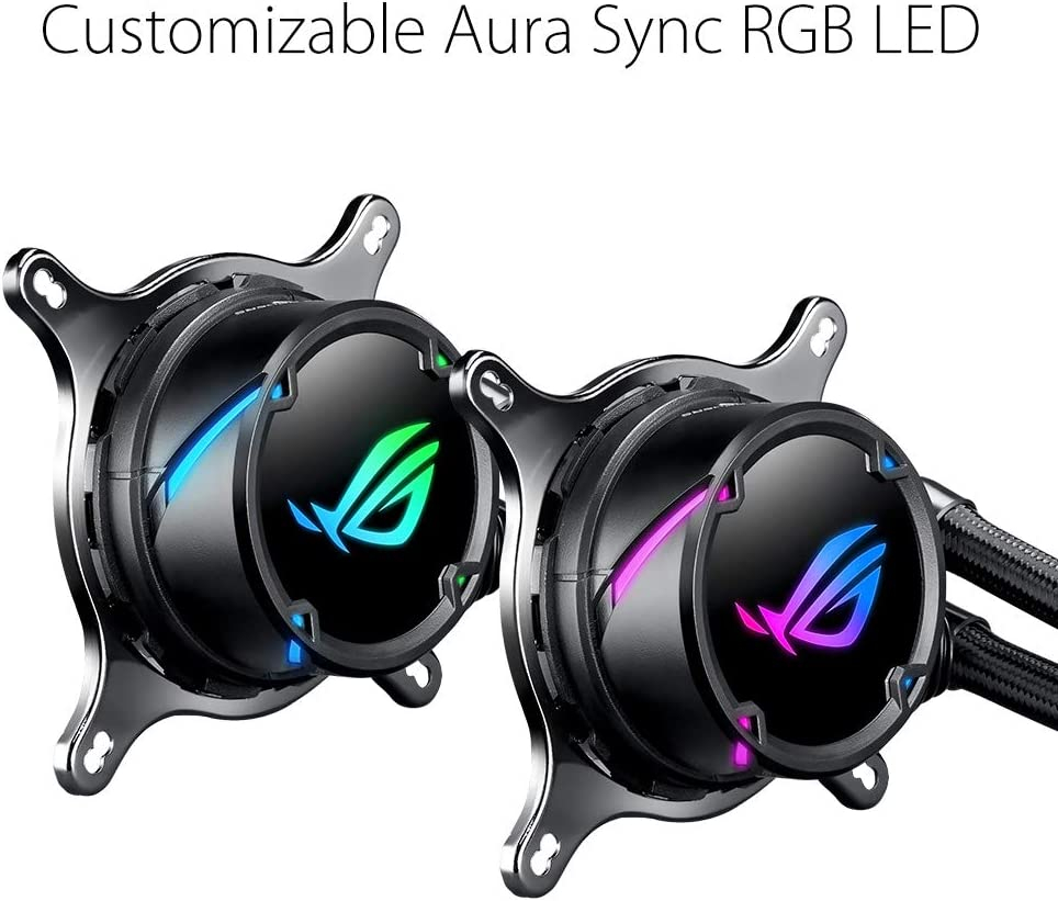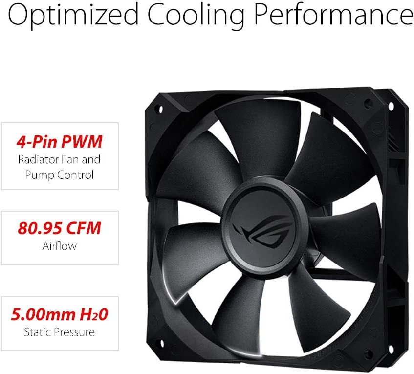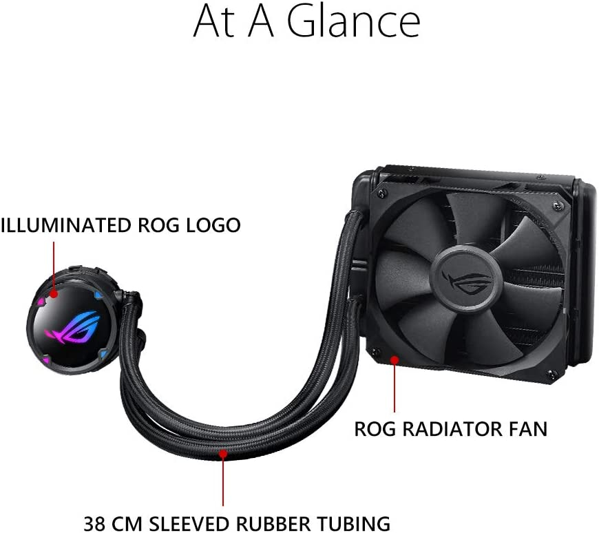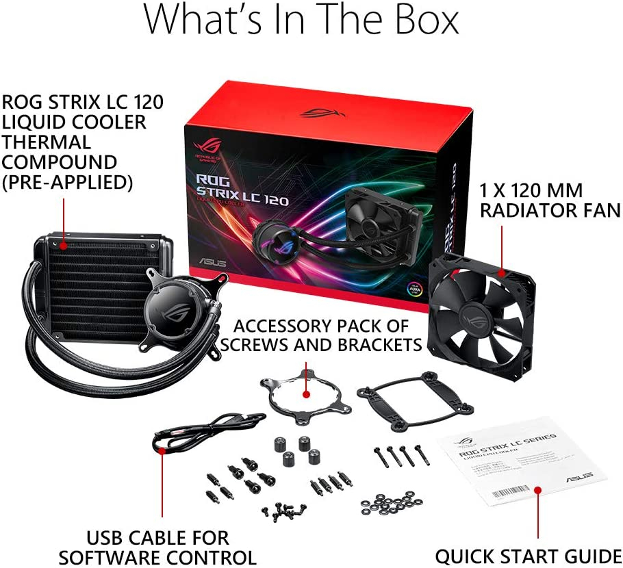 Asus ROG STRIX LC 120. Utilité: processeur, niveau de bruit de ventilateur (Max): 37, 6 dB, connecteur pompe: 4 broches. Type: interne, matériau du bloc de l’eau: cuivre, matière de radiateur: aluminium. Diamètre du ventilateur: 12 cm, Dimensions de ventilateur (L x P x H): 120 x 120 x 25 mm, Largeur du radiateur: 15 cm Poids et dimensions -Dimensions de ventilateur (L x P x H): 120 x 120 x 25 mm> -Largeur du radiateur: 15 cm> -Profondeur de radiateur: 12, 1 cm> -Hauteur du radiateur: 2, 7 cm> -Longueur du tube: 38 cm> -Largeur de l’échangeur: 8 cm> -Profondeur de l’échangeur: 8 cm> -Hauteur de l’échangeur: 4, 5 cm> Informations sur l’emballage -quantité: 1 contenu de l’emballage -vis incluses: oui -instructions d’installation: oui design -type: interne -matériau du bloc de l’eau: cuivre -matière de radiateur: aluminium> -matériau du tube: caoutchouc -voyant d’illumination: oui -couleur de l’éclairage: multicolore> -couleur du produit: noir représentation/réalisation -utilité: processeur -ventilateur intégré: oui -radiateur: oui -prise en charge de la Modulation par Largeur d’impulsion: oui -niveau de bruit de ventilateur (Max): 37, 6 db -connecteur pompe: 4 broches> -nombre de ventilateurs: 2 ventilateurs> -la vitesse du ventilateur (min): 800 tr/min -la vitesse du ventilateur (Max): 2400 tr/min -courant d’air maximum: 80, 95 cfm -prise en charge des douilles du processeur: LGA 1150 (emplacement H3), LGA 1151 (emplacement H4), LGA 1155 (Socket H2), LGA 1156 (Socket H), LGA 1356 (emplacement B2), LGA 1366 (Socket B), LGA 2011 (Socket R), LGA 2011-v3 (Socket R), LGA 2066, emplacement AM4, Socket tr4 -flux d’air: 137, 5 m³/h -pression d’air maximale: 5 mmh2o -nombre de ventilateurs supportés: