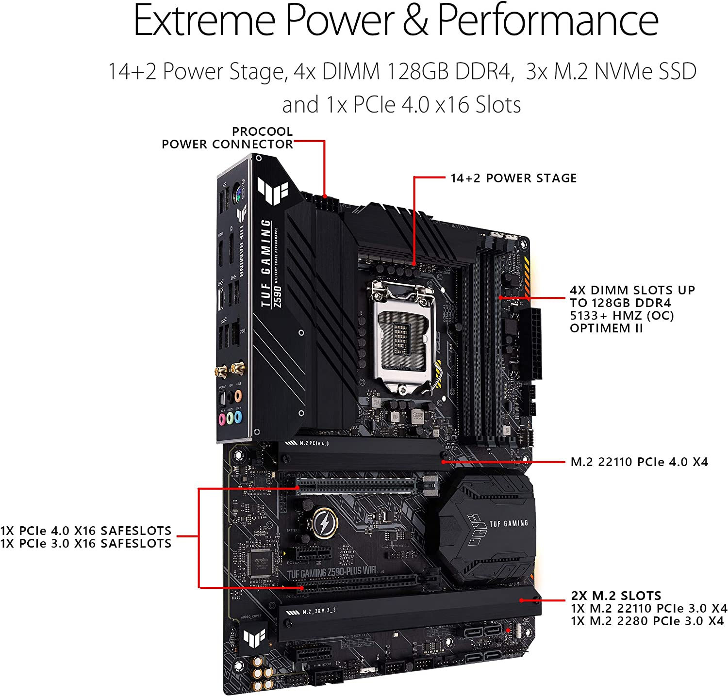 • Solution d’alimentation améliorée : 14+1 DrMOS, circuit imprimé sur six couches, sockets ProCool, bobines en alliage et condensateurs durables pour une alimentation stable