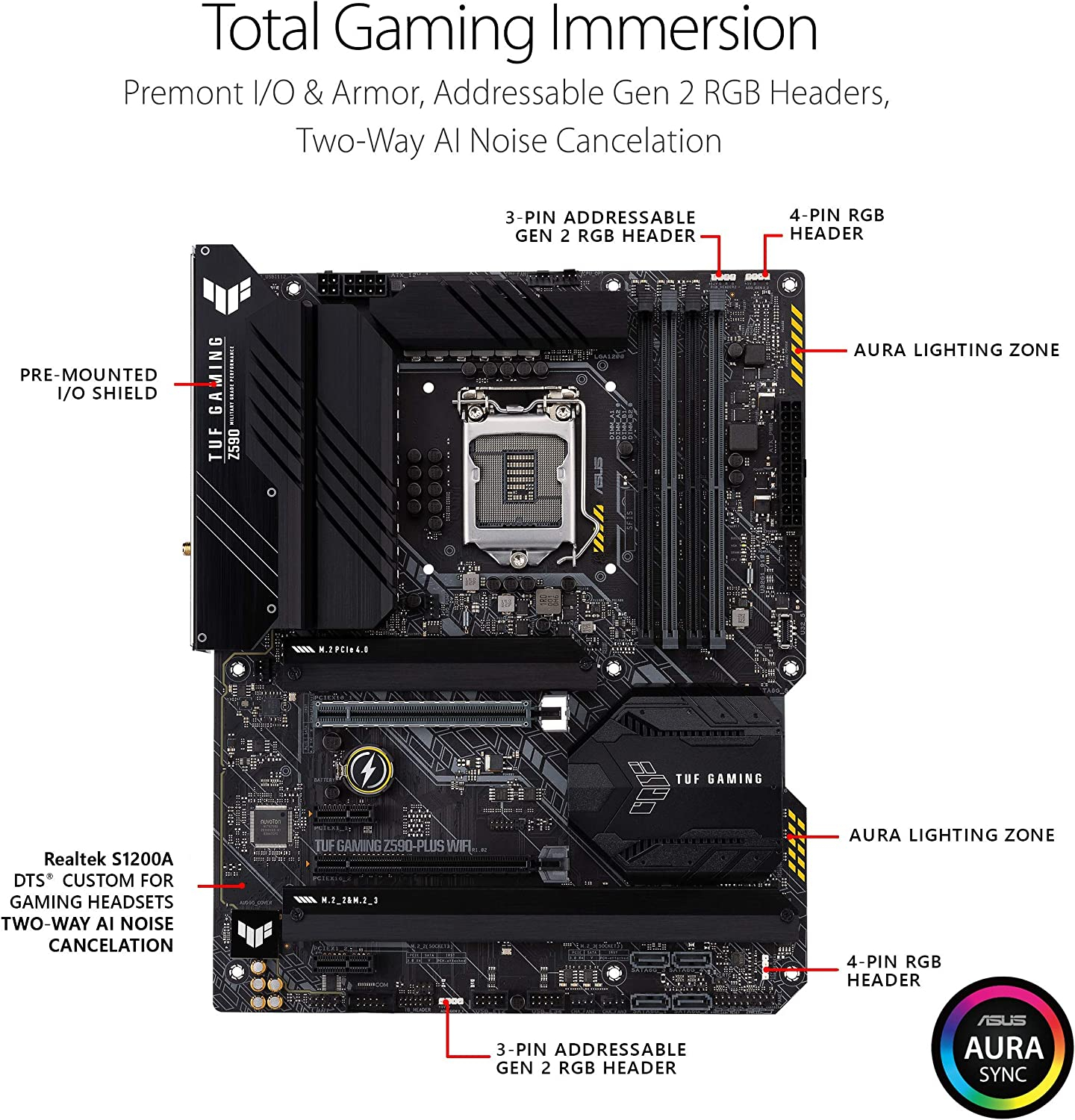 Socket Intel LGA 1700 : Compatible avec les processeurs Intel Core de 12e génération Solution d’alimentation améliorée : 14+1 DrMOS, circuit imprimé sur six couches, sockets ProCool, bobines en alliage et condensateurs durables pour une alimentation stable Connectivité nouvelle génération : PCIe 5.0, USB 3.2 Gen2x2 Type-C à l’arrière, USB 3.2 Gen 2 Type-C à l’avant, connecteur Thunderbolt 4 Conçus pour le gaming en ligne : Ethernet Intel 2,5 Gb, technologie de protection contre les surtensions TUF LANGuard Two-Way AI Noise Cancelation : Réduit les bruits de fond issus du microphone et du son entrant pour des communications limpides, tant lors de vos parties que pendant des visioconférences Refroidissement complet : Radiateur VRM élargi, dissipateur thermique PCH sans ventilateur, dissipateurs thermiques du M.2, connecteurs pour ventilateurs hybrides et utilitaire Fan Xpert 4 dans Armoury Crate Effet Aura RGB Outshine : Conception élégante de l’éclairage des bords et du PCH, prise en charge des connecteurs RGB adressables et des connecteurs à bandes RGB.