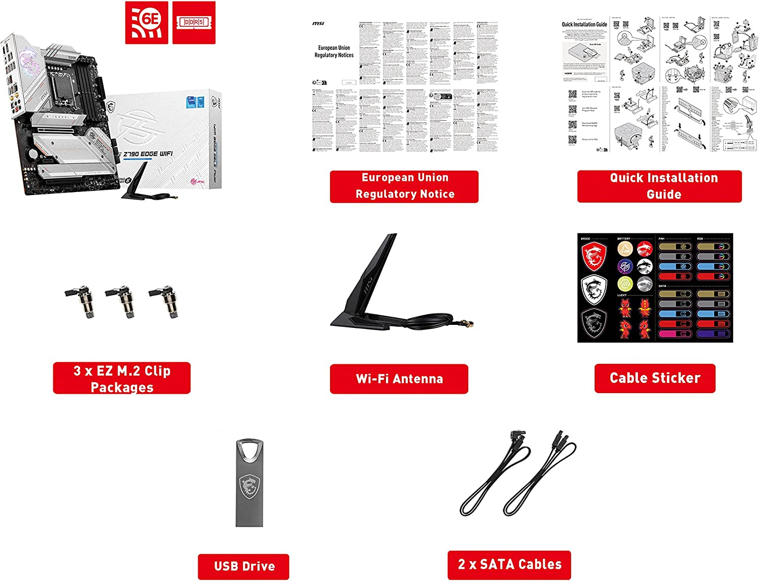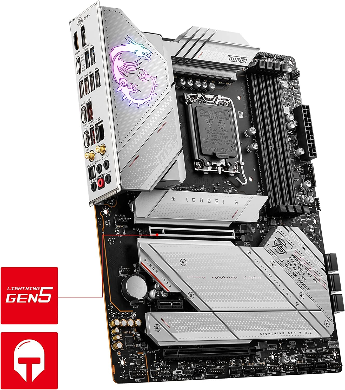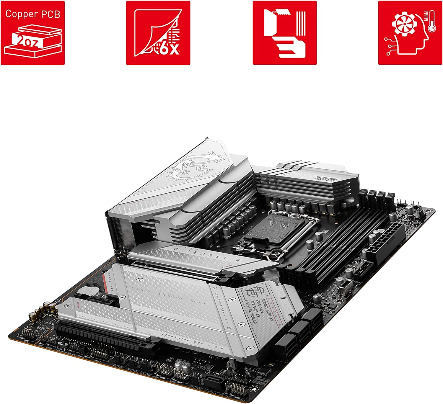 MPG Z790 EDGE WIFI DDR4 : Jouez avec style Conçue pour libérer le plein potentiel gaming du chipset Intel Z790 (support des processeurs Intel Core de 12ème et 13ème génération, LGA 1700), la carte mère MPG Z790 EDGE WIFI DDR4 supporte les cartes graphiques haut de gamme grâce à des slots PCIe 5.0 x16 et PCIe 4.0 x16, des barrettes mémoire DDR4 (5333+ MHz/OC) et des slots M.2 Gen4 avec Shield Frozr. Pour alimenter les processeurs desktop Intel Core 13ème génération, la MPG Z790 EDGE WIFI DDR4 dispose d’une alimentation double rail à 16 phases (SPS 90 A) et de deux connecteurs CPU à 8 broches, et plusieurs fonctions de refroidissement passif se chargent de la garder à bonne température. Les cartes mères gaming MSI Z790 proposent un circuit imprimé de niveau serveur robuste composé de couches de cuivre de 2 onces, ainsi qu’un slot PCIe Steel Armor pour supporter le poids des cartes graphiques les plus lourdes. La connectique comprend un connecteur Intel 2,5G LAN, un port USB 3.2 Gen2x2 Type-C (20 Gb/s), le support de la résolution 4K/60 Hz et un port USB avec fonction audio 7.1. Côté connexion, elle propose les normes Intel Wi-Fi 6E et Bluetooth 5.2. Pour les gamers à la recherche d’une carte mère supportant les processeurs Intel de 12ème ou 13ème génération et rassemblant la norme PCIe 5.0 x16, la mémoire DDR4 et la solution de stockage M.2 Gen4, la carte mère MSI MPG Z790 EDGE WIFI DDR4 est le modèle idéal.