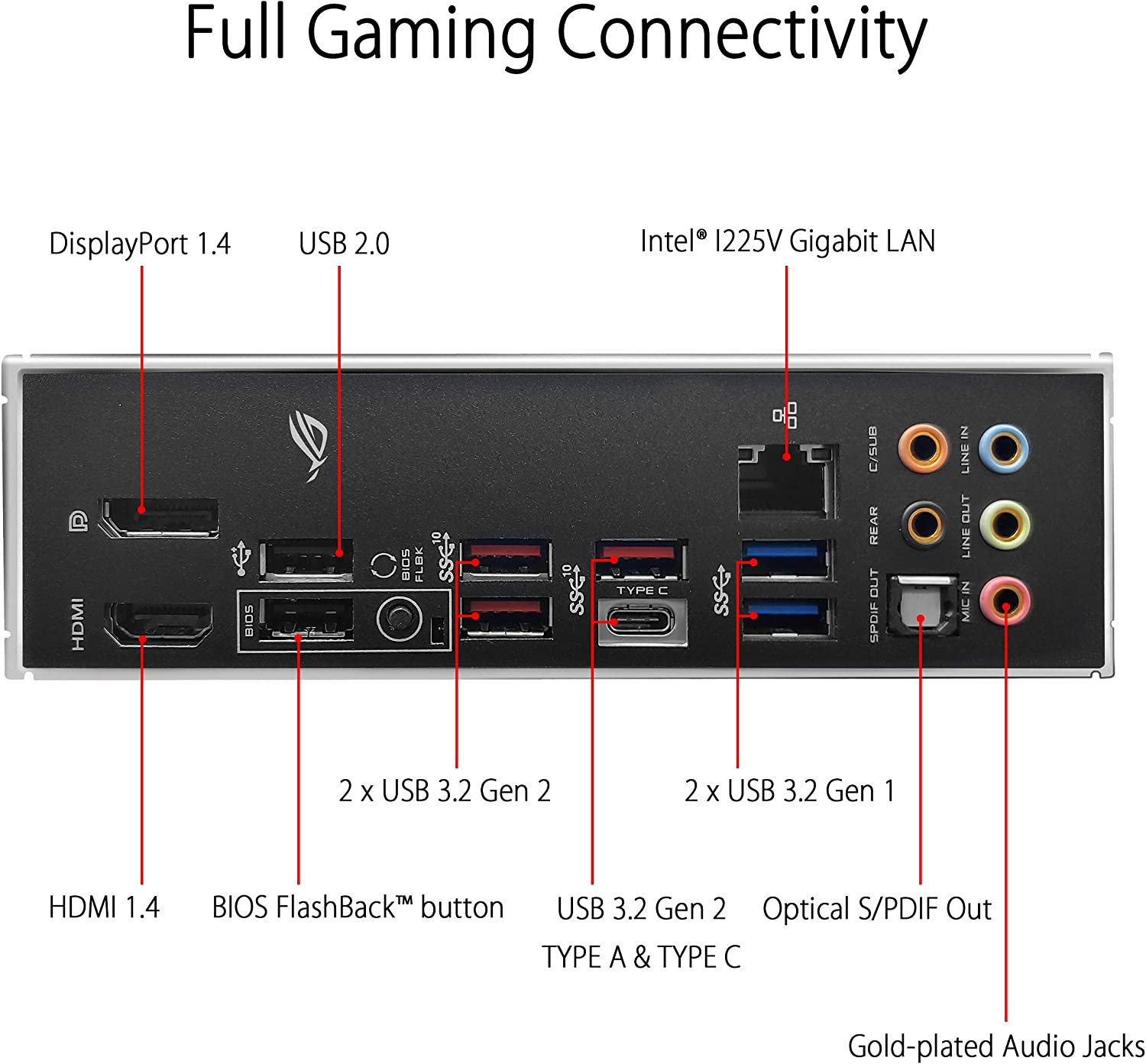 • Socket Intel LGA 1700 : Compatible avec les processeurs Intel Core™ 12e génération, Pentium Gold et Celeron • Solution énergétique optimale : 16+1 DrMos avec 8+8 connecteurs d’alimentation ProCool II, bobines en alliage de qualité et condensateurs durables pour supporter les processeurs multi-cœurs • Design de refroidissement amélioré : Protection E/S intégrée et radiateurs VRM avec protection thermique hautement conductrice, quatre dissipateurs thermiques M.2 embarqués et plaque arrière M.2 pour slot M.2_1 • Réseau haute performance : Intel WiFi 6 (802.11ax) embarqué et Ethernet Intel 2,5 Gb avec ASUS LANGuard • Meilleure connectivité gaming : Compatible HDMI 2.1 et DisplayPort™ 1.4 en sortie, quatre slots M.2 et USB 3.2 Gen 2×2 Type-C • Contrôle intelligent :Technologies ASUS exclusives, AI Overclocking et Two-Way AI Noise Cancelation pour simplifier l’installation et améliorer les performances • Design sur-mesure : Slot PCIe Q-Release, M.2 Q-Latch, organisateur de câbles ROG réutilisable, protection E/S ROG prémontée, bouton BIOS FlashBack™, Bouton Clr CMOS • Personnalisation incomparable : Éclairage exclusif ASUS Aura Sync RGB, comprenant un connecteur RGB et trois connecteurs adressables Gén. 2 • Gaming audio de pointe : Haute-fidélité audio grâce à ALC4080 avec amplificateur Savitech SV3H712, ainsi qu’au DTS Sound Unbound et au Sonic Studio III • Logiciel de renom : AIDA64 Extreme essai gratuit pendant 60 jours et interface intuitive du BIOS UEFI avec MemTest86
