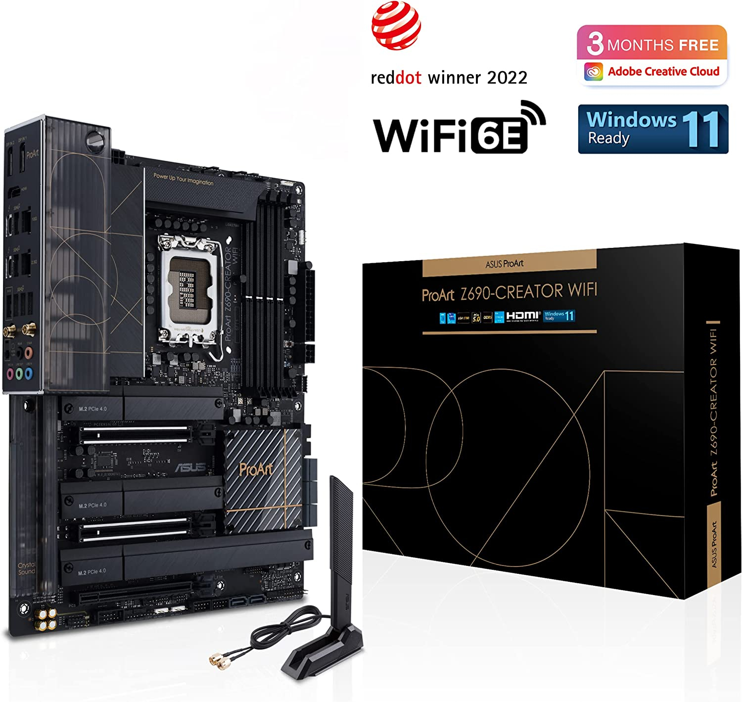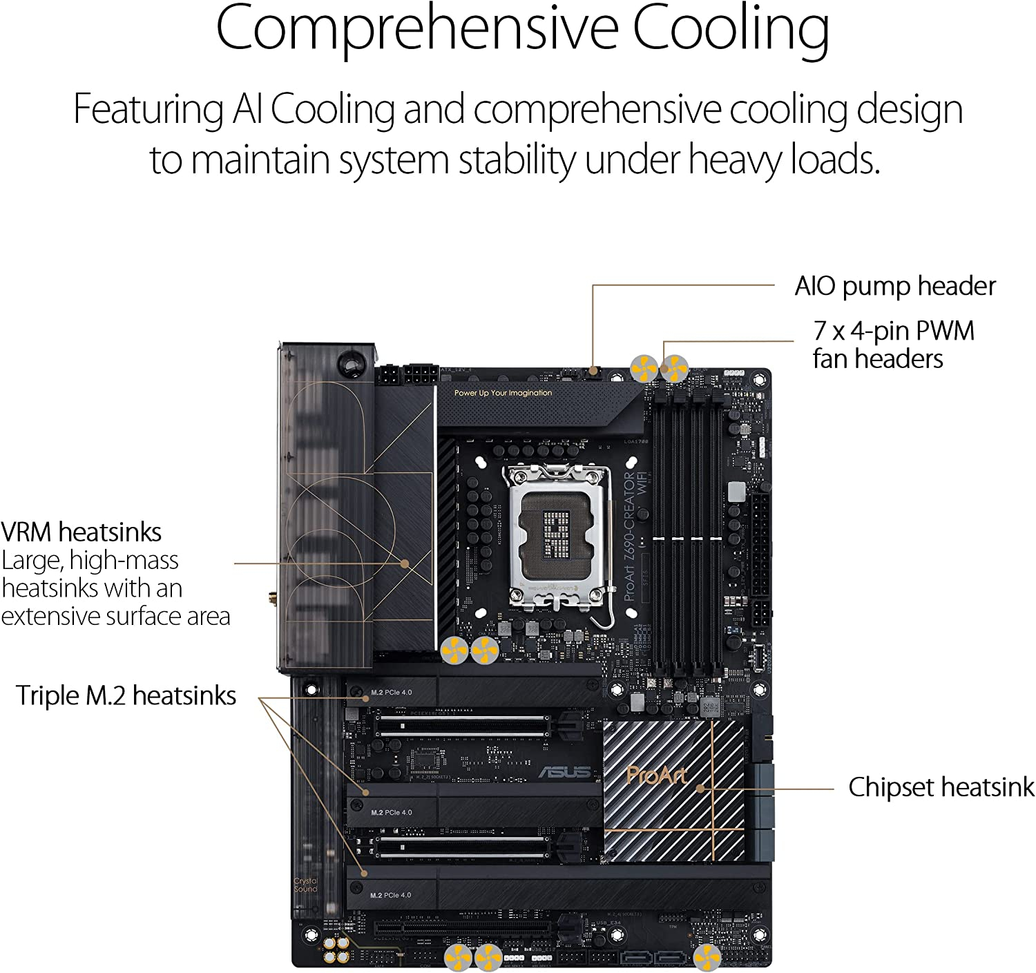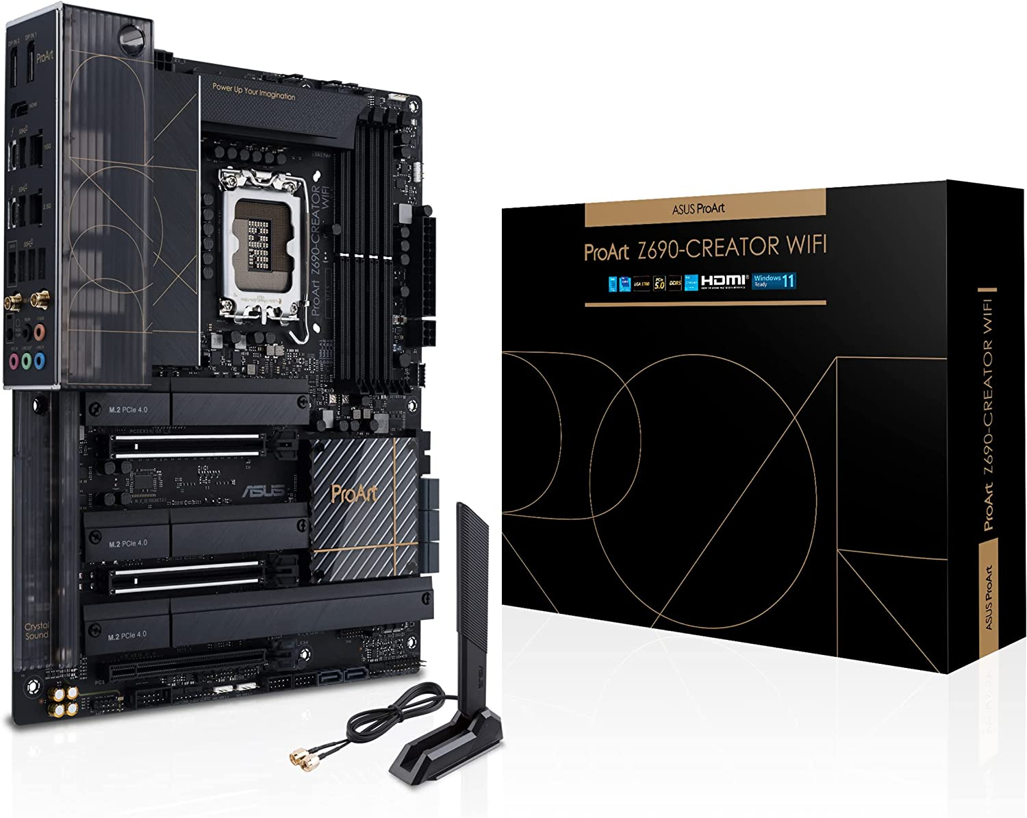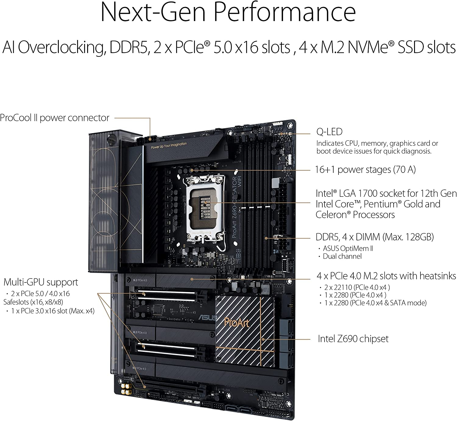 Socket Intel LGA 1700 pour processeurs Intel Core 12e génération, Pentium Gold et Celeron. Connectivité à l’épreuve du temps : Deux ports Thunderbolt 4 Type-C, Ethernet embarqué 10 Gb & 2,5 Gb, Wi-Fi 6E, quatre slots PCIe 4.0 M.2 et un connecteur avant USB 3.2 Gen 2×2 avec Quick Charge 4+. Performances de nouvelle génération : 16+1 phases d’alimentation évaluées à 70 A, compatible PCIe 5.0, et DDR5 plus rapide. Optimisation intelligente : Les logiciels et micrologiciels ASUS exclusifs simplifient l’installation et améliorent les performances : AI Overclocking, AI Cooling, CreationFirst et Two-Way AI Noise-Cancelation. Design thermique global : Un grand radiateur VRM et chipset, des dissipateurs thermiques M.2 en aluminium, sept connecteurs à 4 broches pour ventilateur PWM et un connecteur pour pompe tout-en-un. Gestion avancée de la sécurité : Gestion des ports USB, liste noire de logiciels et activation/désactivation de l’éditeur de registre via le Centre de contrôle express ASUS. Stabilité prouvée : La carte a été soumise à de rigoureux tests démontrant sa fiabilité 24h/24, 7j/7 et sa sûreté grâce au port SafeSlot qui accroît sa durabilité