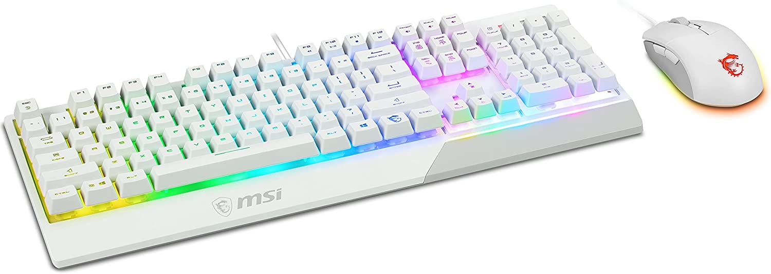 Jouez avec style avec le pack VIGOR GK30 COMBO WHITE FR qui propose le clavier VIGOR GK30 WHITE et la souris Clutch GM11 WHITE.MSI CLUTCH GM11 WHITE est une souris Gaming filaire de 89g idéale pour le gaming polyvalent.Équipée d’un capteur optique PixArt PWM-3325, la CLUTCH GM11 WHITE dispose de 5 niveaux de DPI allant de 400 à 5000, et d’un polling rate de 1000Hz. Les boutons Gauche/Droit à switches OMRON durables sont évalués pour plus de 10 millions de clics chacun. Grâce à sa conception symétrique, elle est parfaite pour les joueurs droitiers comme gauchers.MSI VIGOR GK30 WHITE est un clavier Gaming filaire blanc à membrane à sensation mécanique élégant et pratique avec un design résistant à l’eau et aux éclaboussures.Les switches de type “plunger” à sensation mécanique comprennent une structure en 3 parties très robuste. Le châssis robuste est doté du Gaming Base antidérapant et qui empêche également toute flexion indésirable.Le clavier VIGOR GK30 WHITE et la souris Clutch GM11 WHITE offrent tous deux un éclairage RGB Mystic Light.