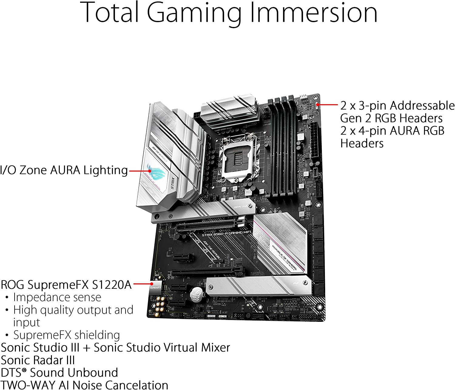 Carte mère Intel B560 LGA 1200 au format ATX avec PCIe 4.0, 8+2 phases d’alimentation unifiées, Two-Way AI Noise Cancelation, Wi-Fi 6 (802.11ax), Ethernet Realtek 2.5 Gb, deux slots M.2 avec radiateurs, USB 3.2 Gén. 2×2 USB Type-C, SATA et Aura Sync RGB